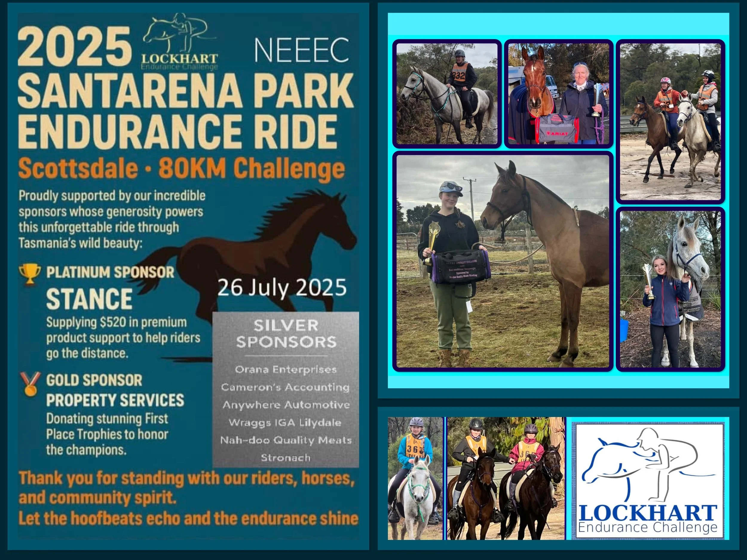 The NEEEC committee held the annual Lockhart Challenge at Santarena Park on the 26th July. The weather forecast deterred the pleasure riders, with no participants in the 20km event, however the true grit spirit of endurance saw 21 x 80km and 8x 40km riders, saddling up and heading out on the course to endure 3 solid hours of riding in the rain.